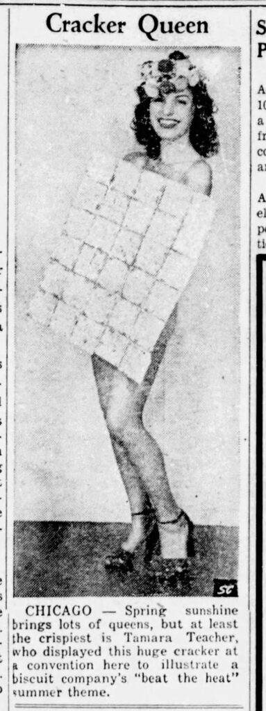 In June 1947, photos appeared in Illinois newspapers of Tamara Teacher in a swimsuit and wearing a giant cracker to advertise for a biscuit company at a convention in Chicago. No further context is given to the photo, and it’s not even clear if this is the same person, though I suspect it is.