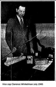 Joseph Piscione, who called himself the “honorary vice president,” was called to testify on November 28. It was pointed out to him that the club’s charter says members must be of good moral character. He responded, “It must be so if that’s what it says there.” State attorney Stewart Honeck then brought out the photos and criminal records for 20 members, who had offenses ranging from gambling all the way up to murder. (The murderer was James Leonard Carter, who killed a man in Ohio in 1920. He also had a counterfeiting arrest in Chicago in 1944.) Piscione explained the phones as ways to contact service members, and the bulletin board allegedly for posting race results was actually to hang up news clippings of war heroes. When asked about the 2×4 keeping the door shut, he said the “doors were very flimsy.” Honeck was annoyed that the role of president and vice president were transferred to members in the service (not identified in the newspaper) because the law said papers could not be served on active service members. This effectively blocked many legal options.